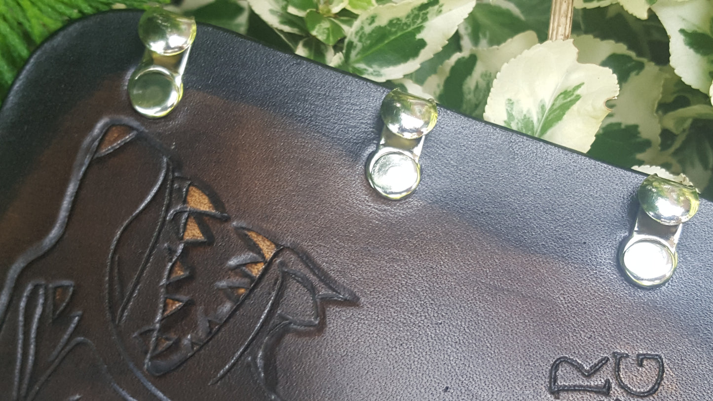 The design is a Direwolf, the Sigil of House Stark from Game of Thrones, with the iconic House words 'Winter is Coming' below the design. The scales, eyes and teeth of the Direwolf have been treated with Acrylic Resolene before the Dye is applied, giving a nice 'resisted' look which really makes the design stand out. An Antique Black Leather Dye has been used, which is faded out to a Black Tannery Dye, which really frames the design nicely and draws the eye to the centre design.