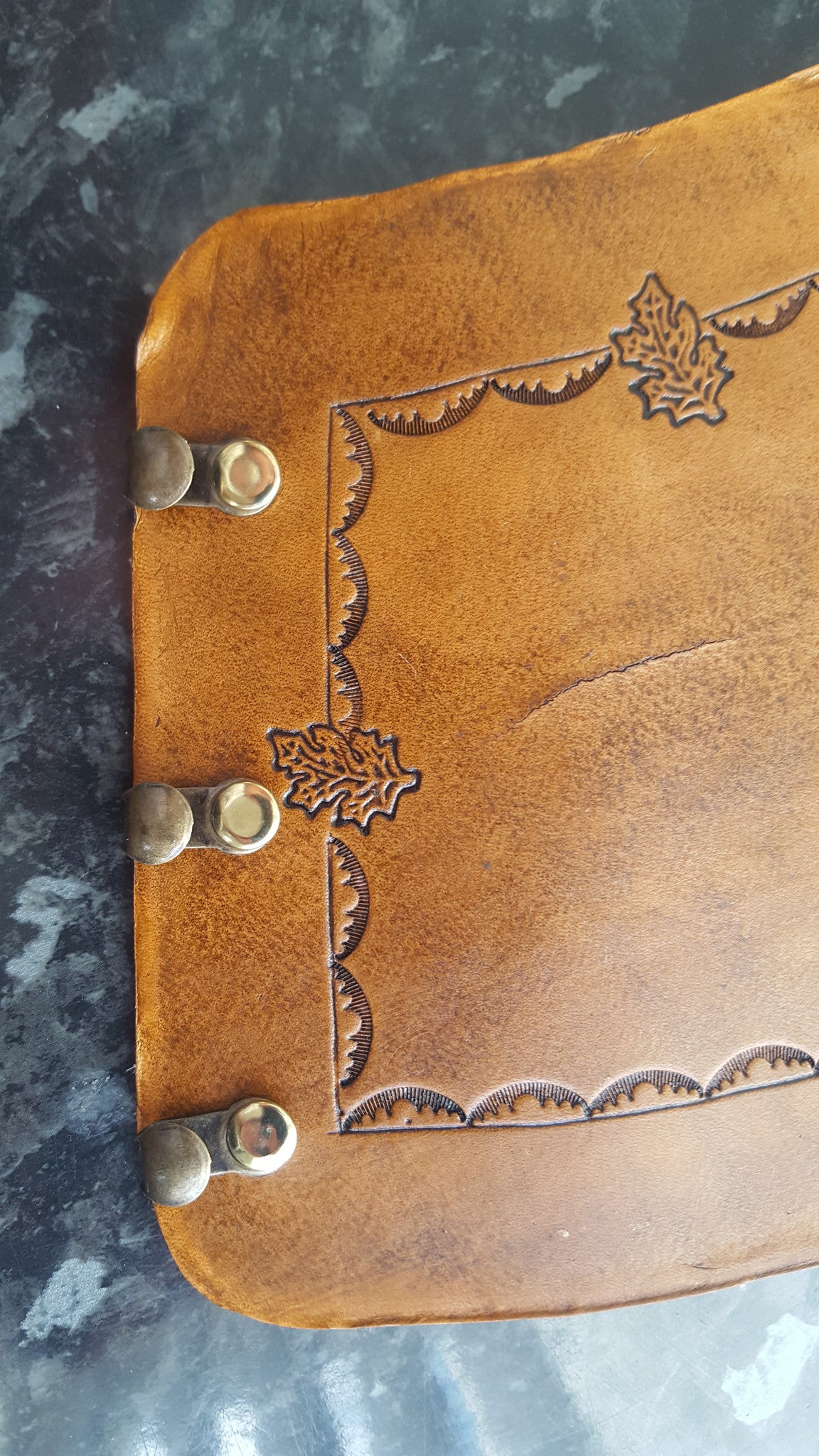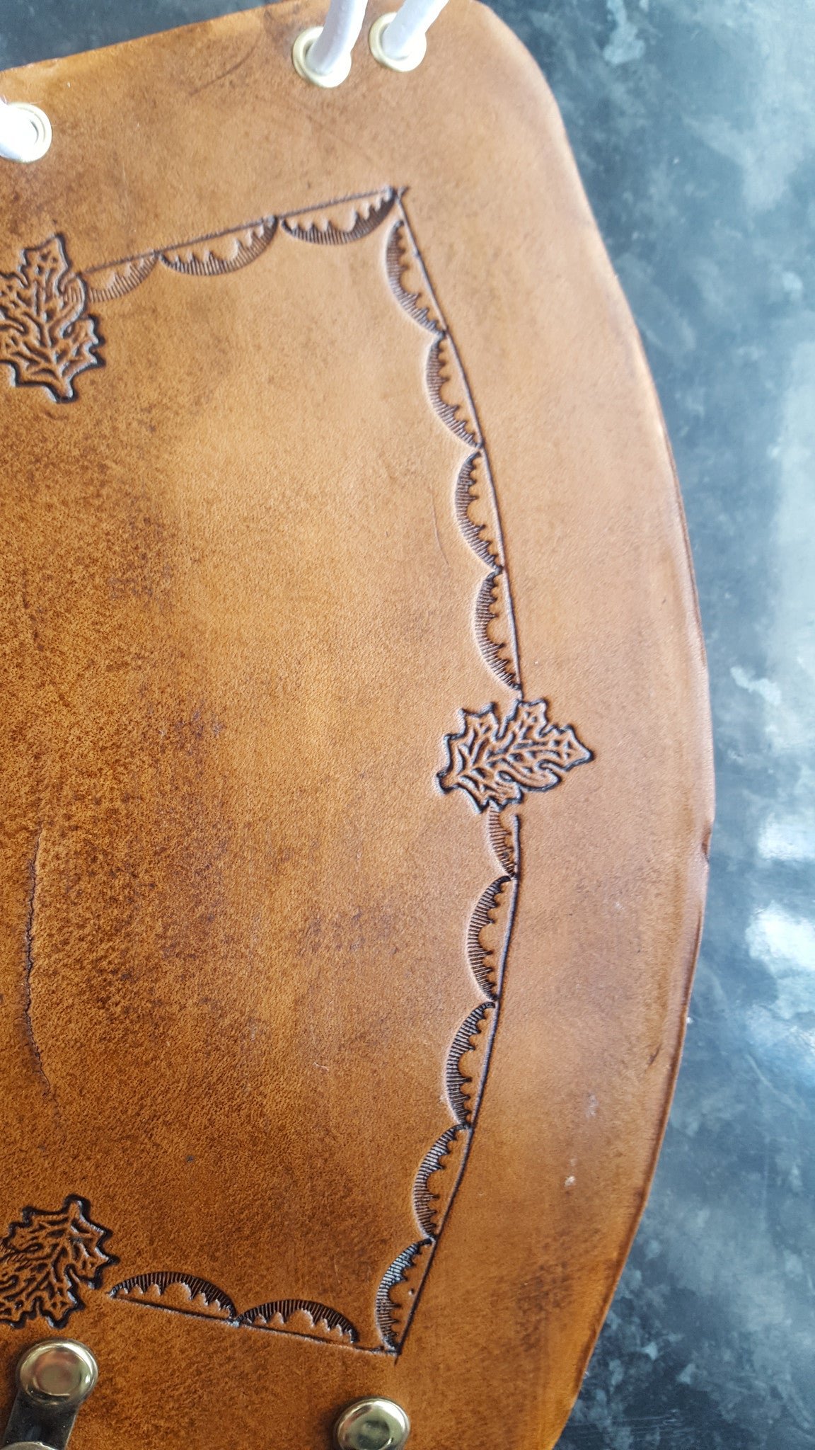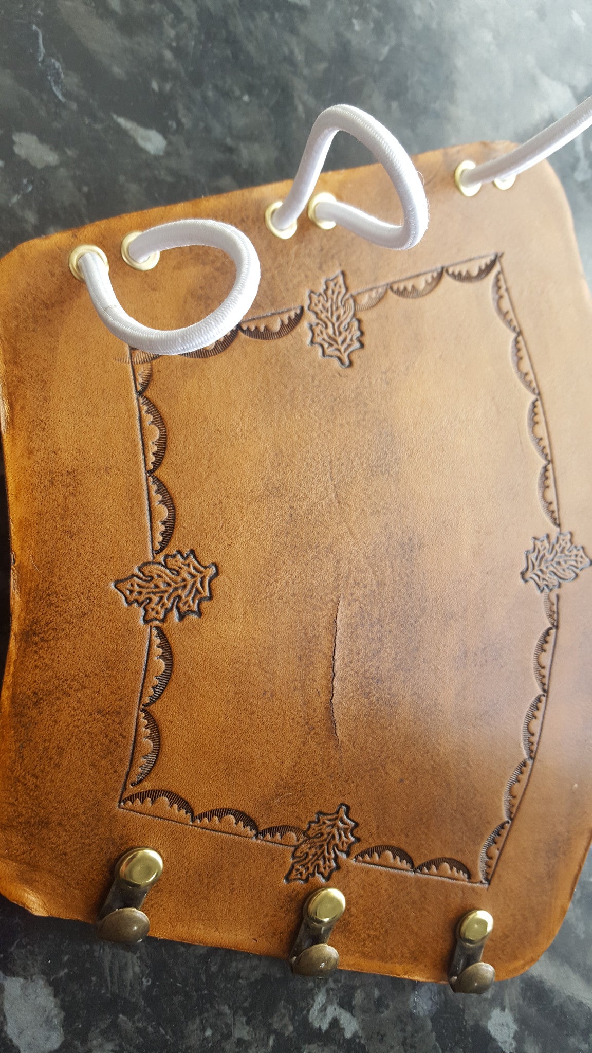 The whole bracer has been dyed with multiple coats of a Briar Brown leather stain to give an Antique finish whilst enhancing the cuts in the leather for great contrast. It has been finished with a coat of Resolene to give it a nice weatherproof finish and a beautiful mellow sheen.