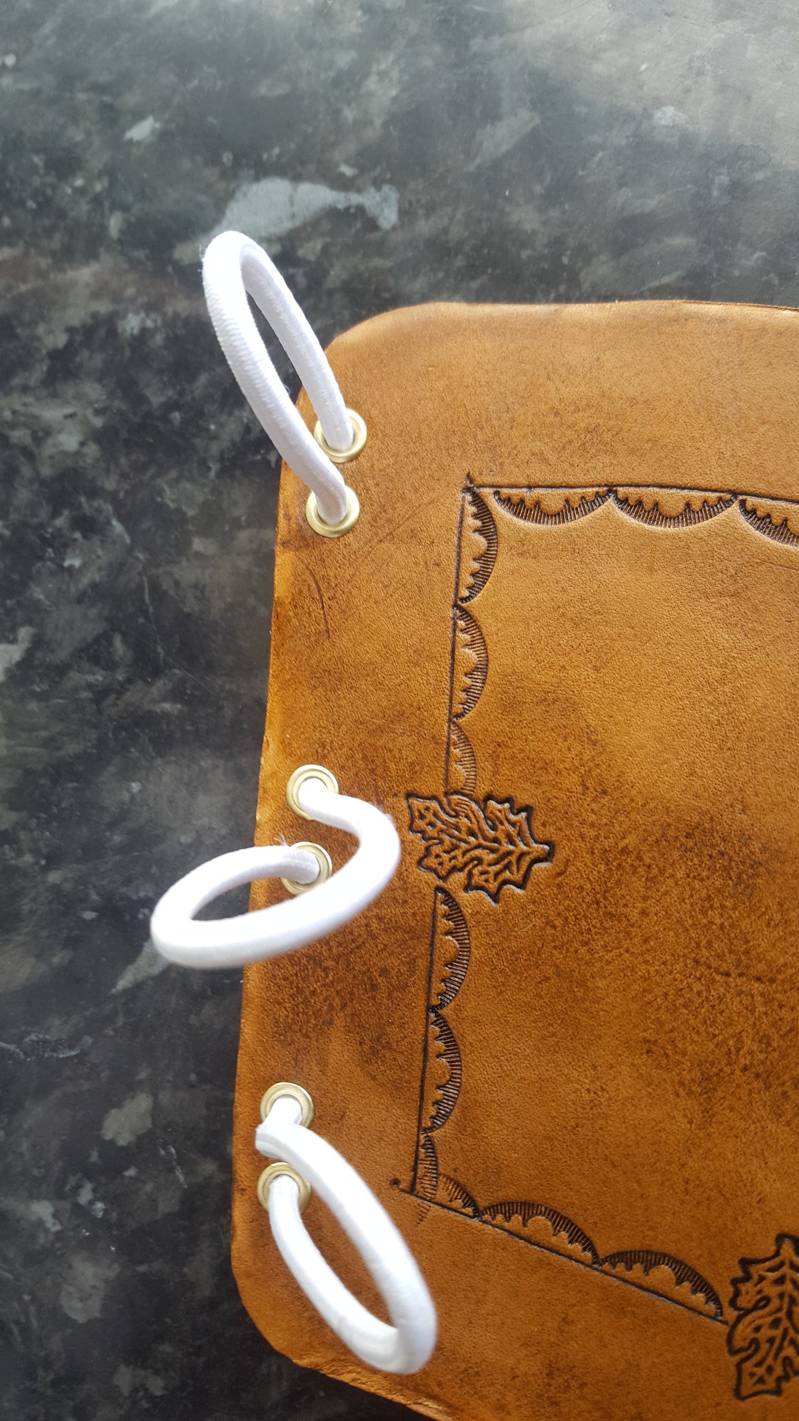The bracer fastens with White elestic cord around Old Brass lace hooks, making for a quick and easy set up before shooting. The elastic lace can be adjusted to suit length by untying the knot and shortening/lengthening as needed. As the lace has some stretch and nice tight fit can be easily achieved. Brass eyelets have been used for ease of adjustment and to protect the leather holes as well as giving a nice visual effect.
