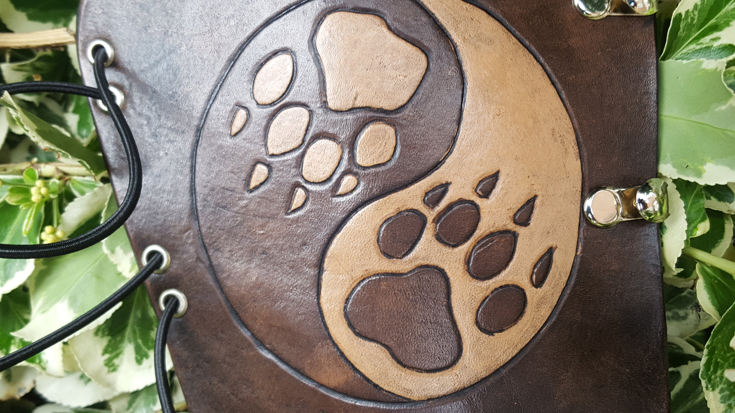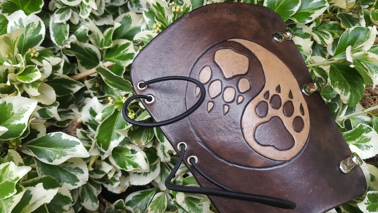 The design is a ying yang symbol in the shape of two wolf prints, all hand carved. An Antique Black dye has been used to give the design a nice contrast. other colours are available upon request. The bracer has been finshed with two coats of Resolene and one coat of Carnuba Creme for weather protection and to give the design a nice mellow finish.