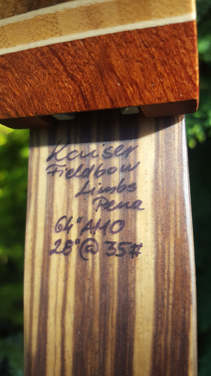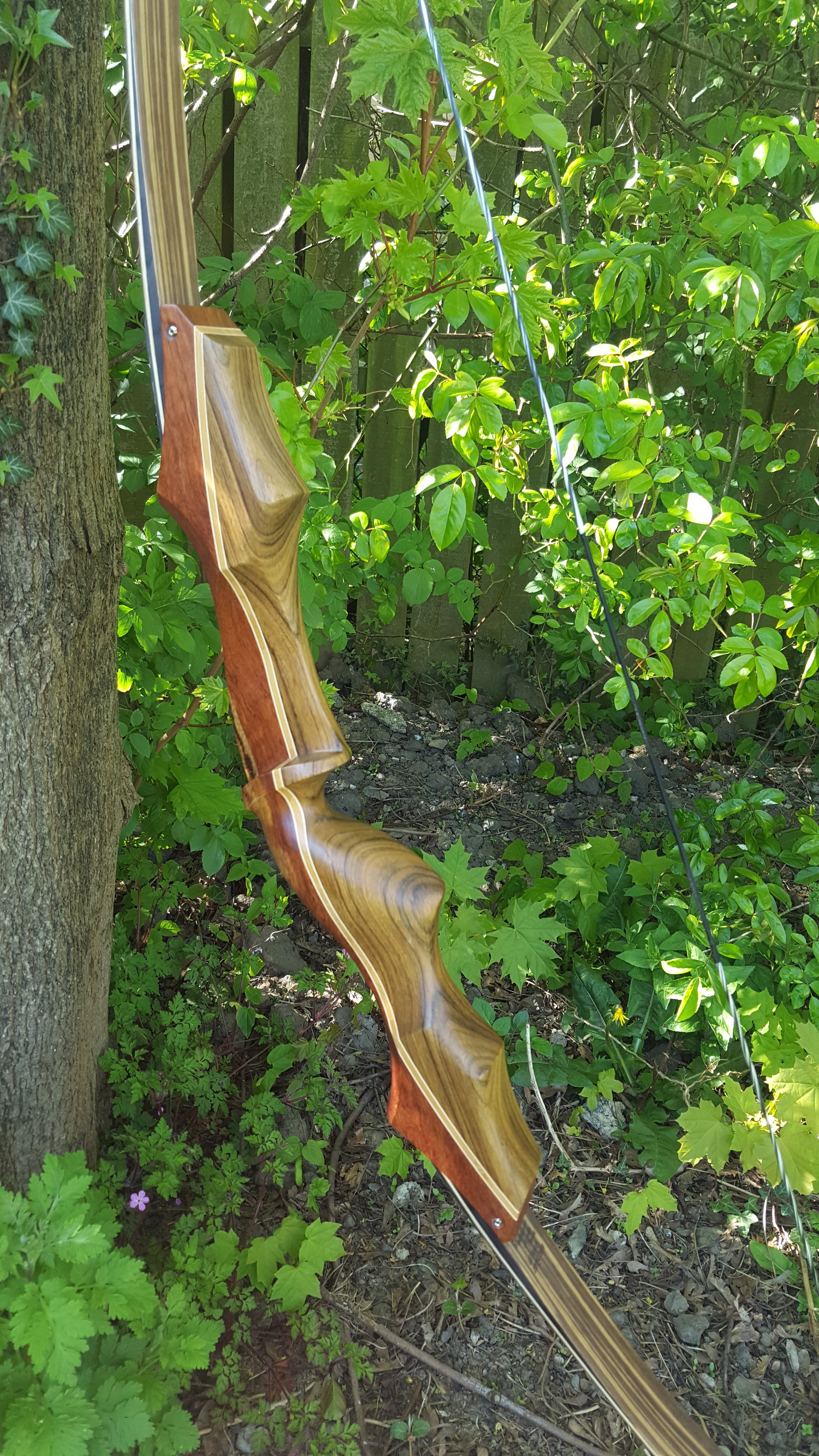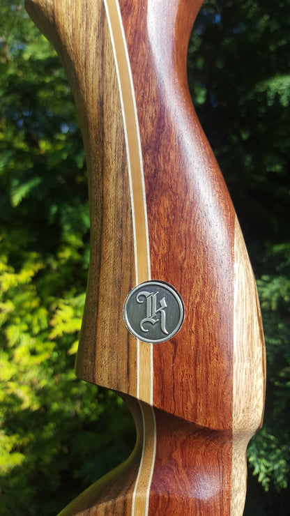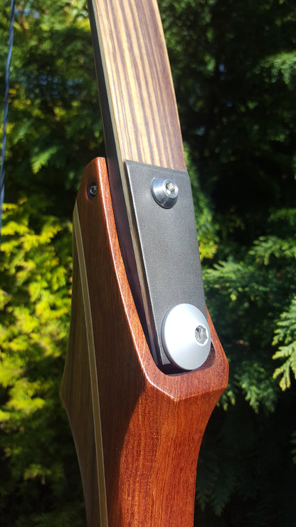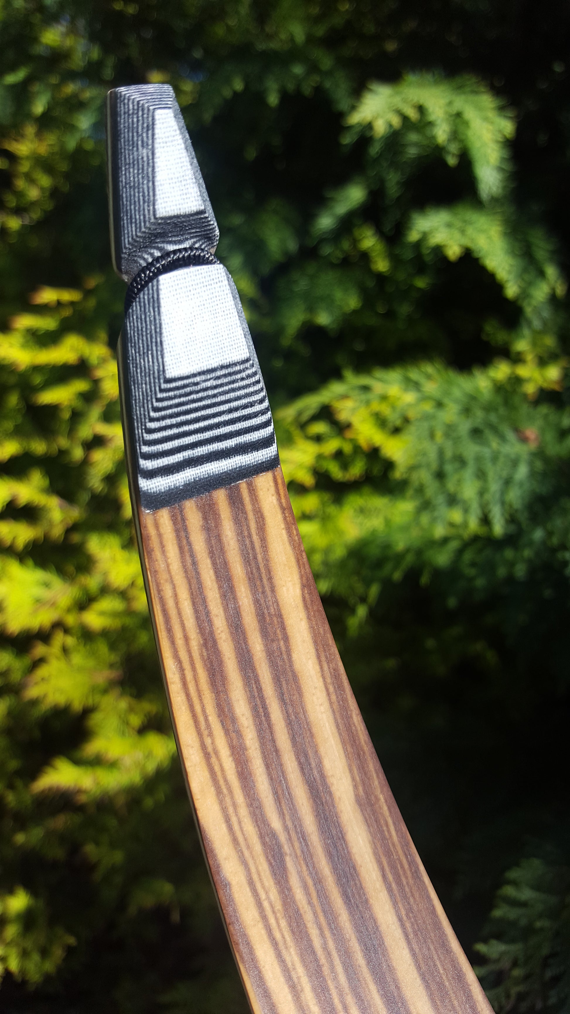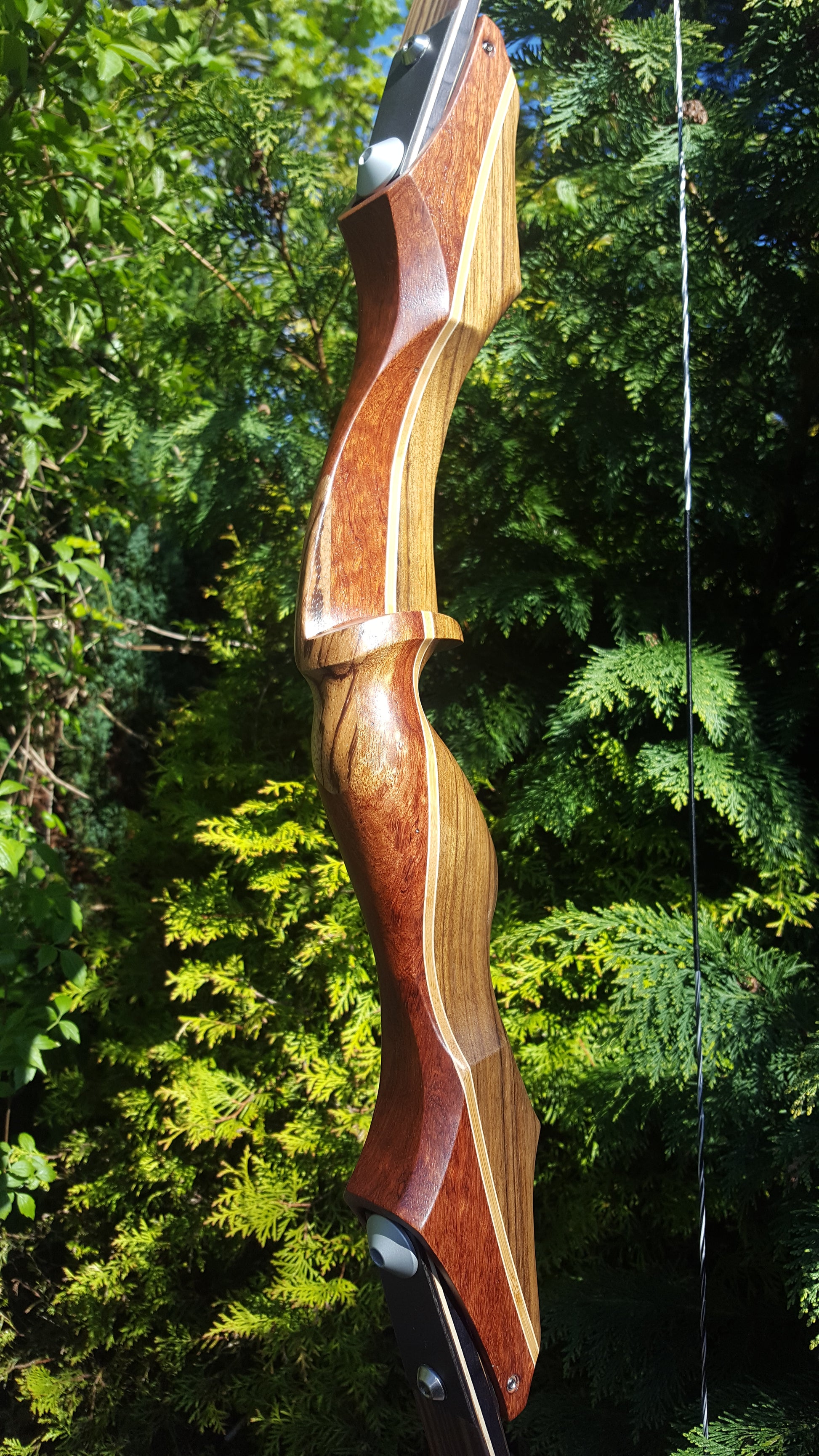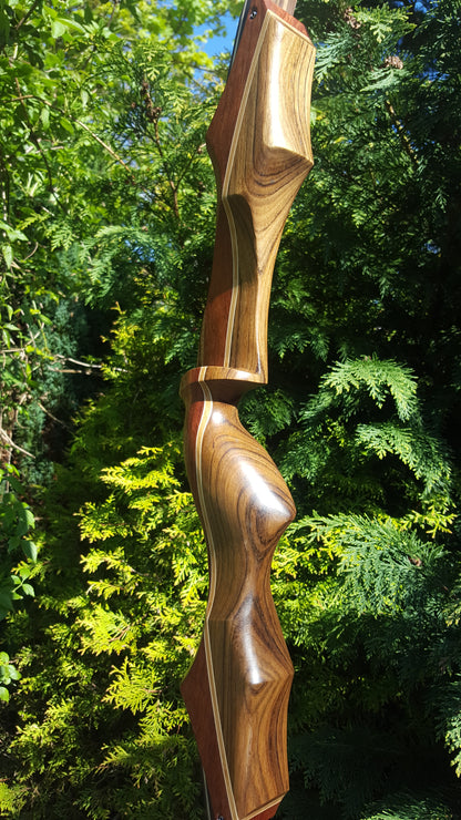 The 21” Bubinga and Amazaque riser combines with clear fibreglass and Zebrano wood limbs for a versatile and smooth shooting 64” bow.