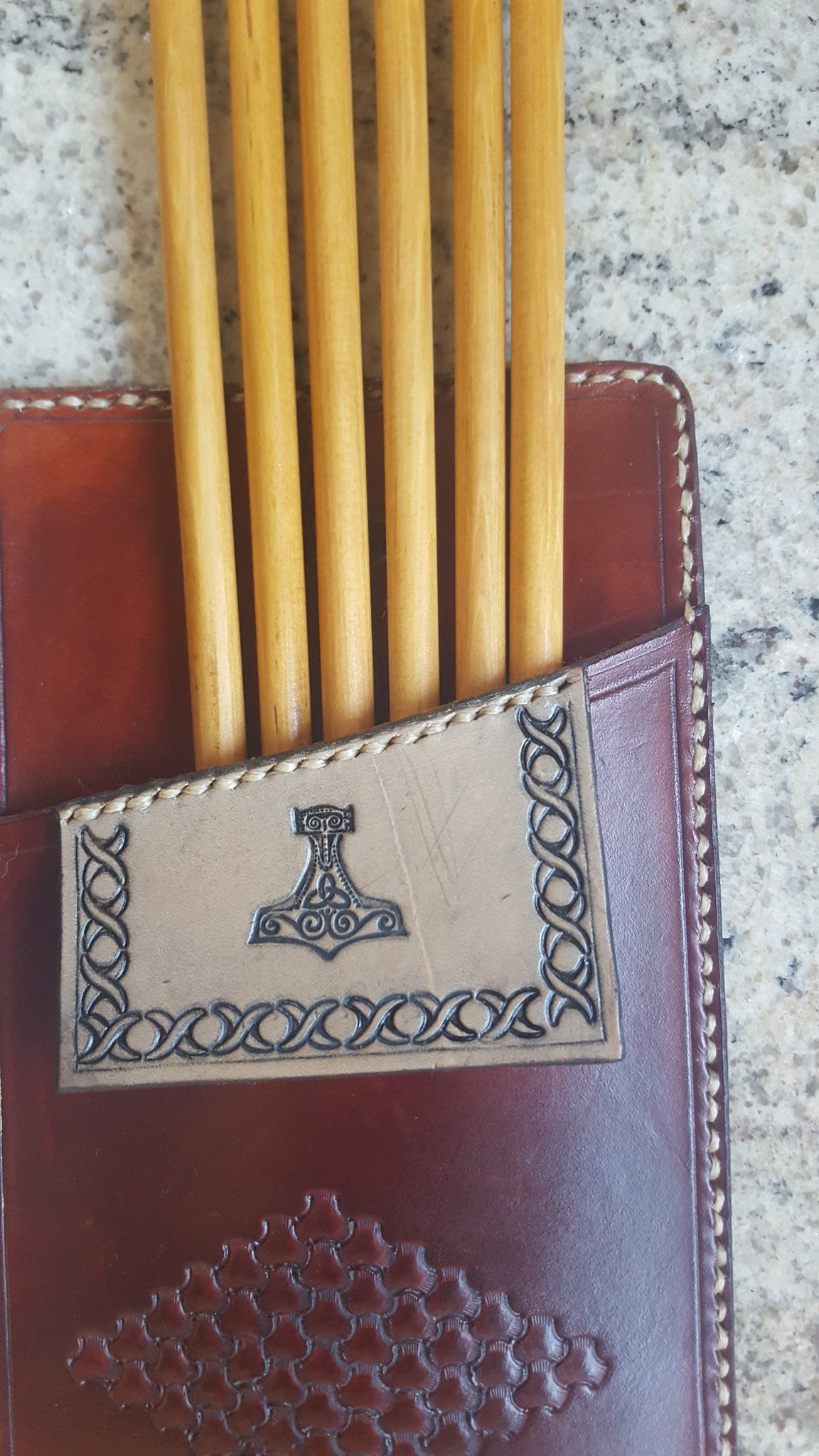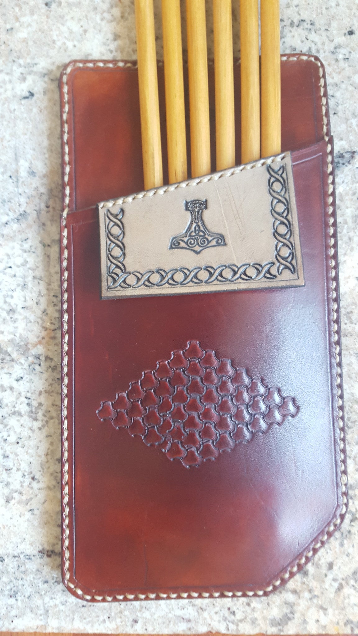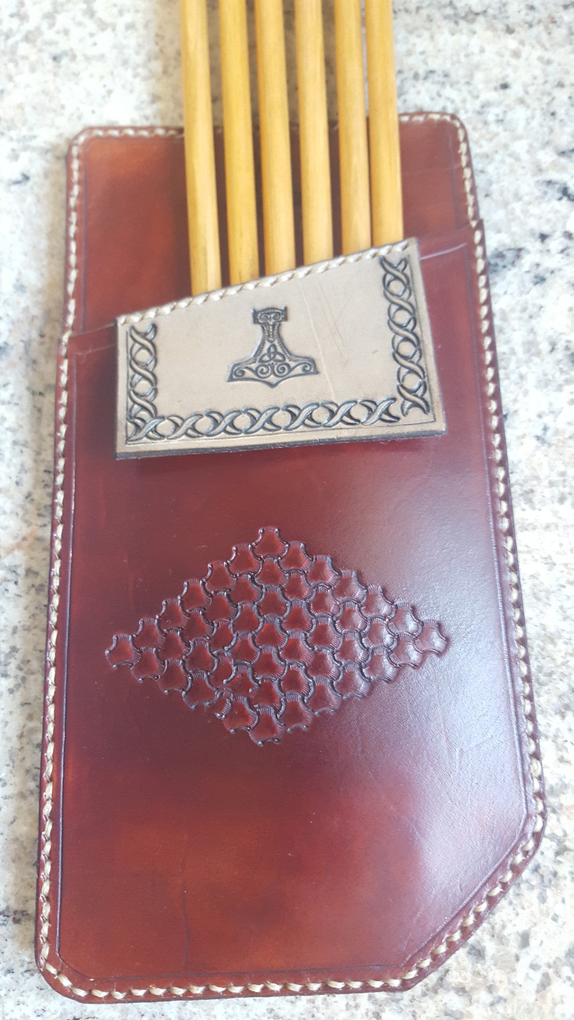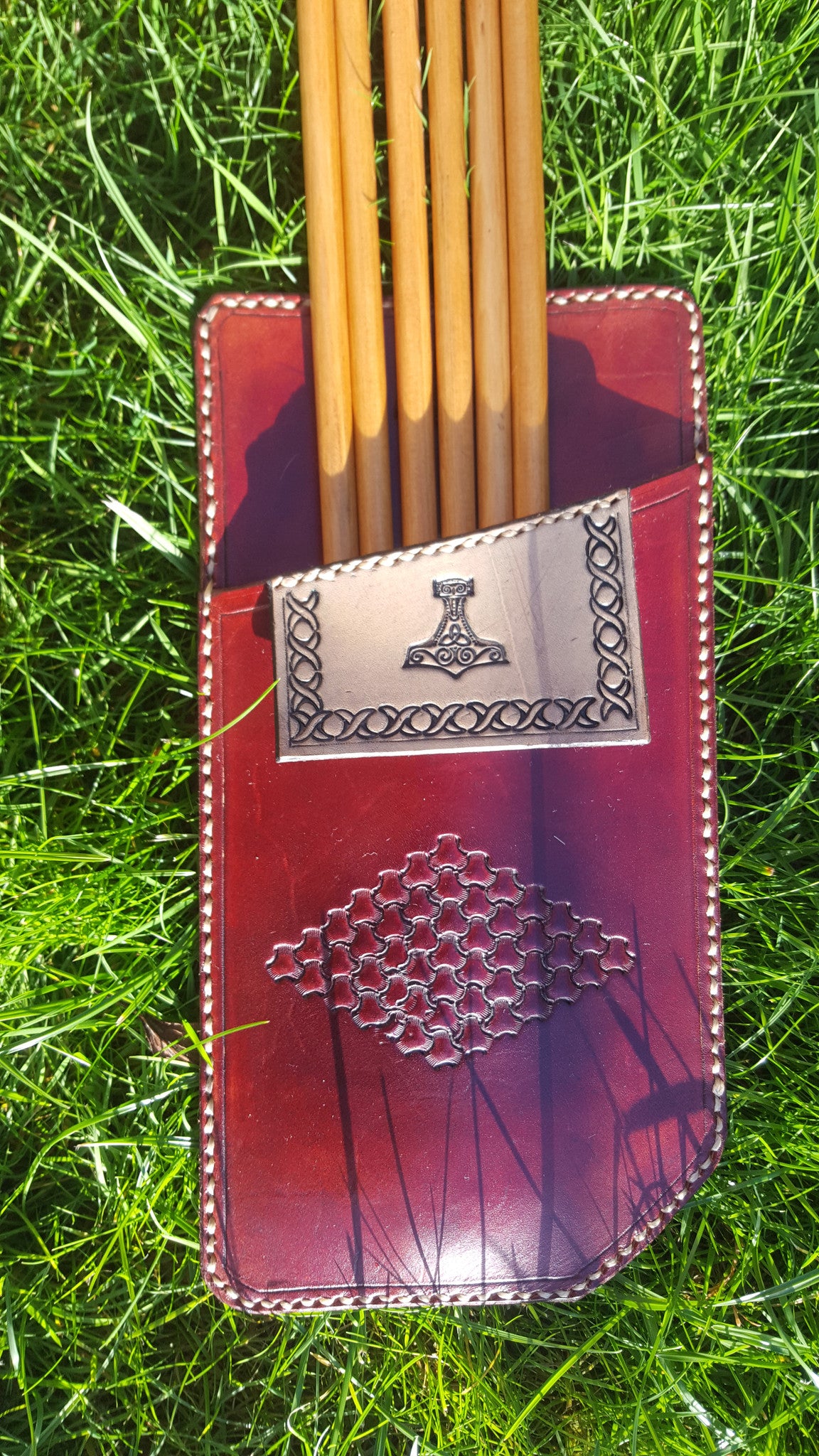 A Mahogany dye has been used on the main body of the quiver with a basket weave pattern and a Smoke Black Antique has been used on the pocket flap to make the Thor's Hammer stamp stand out..