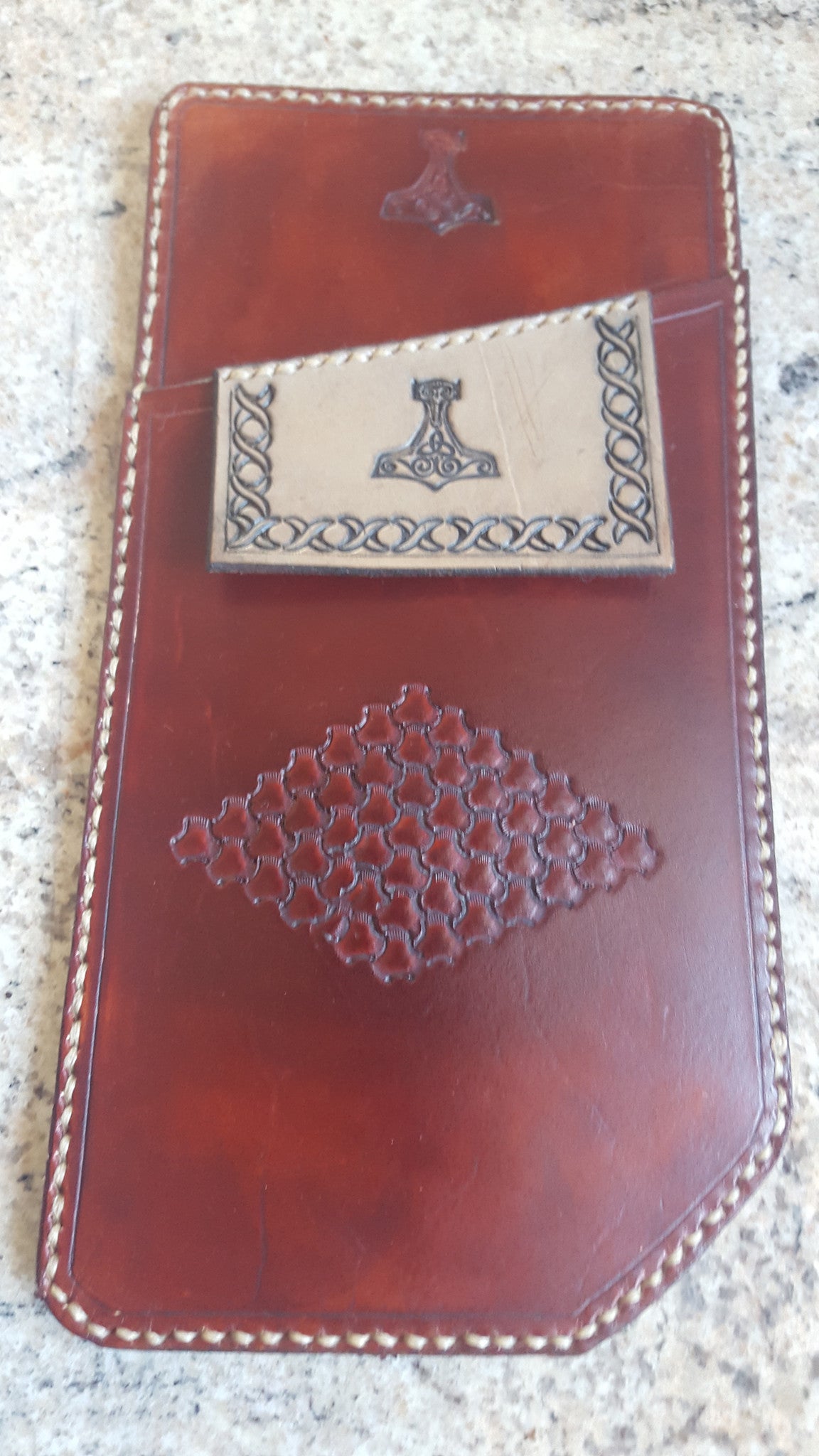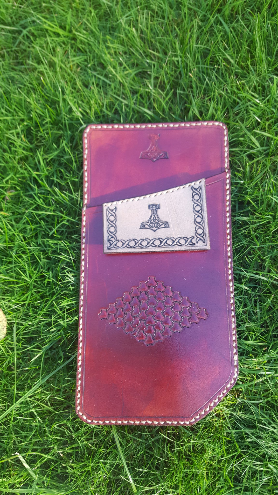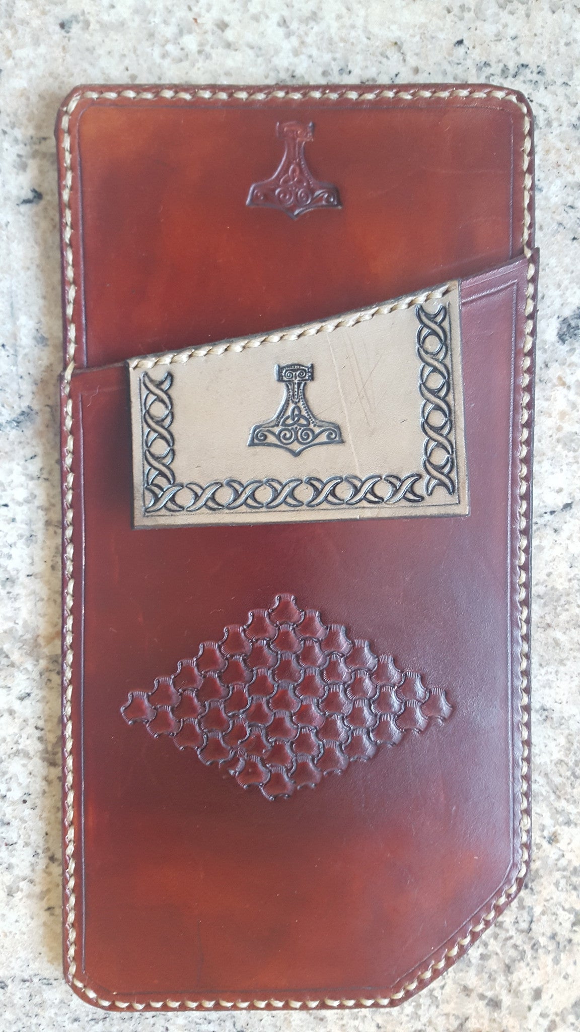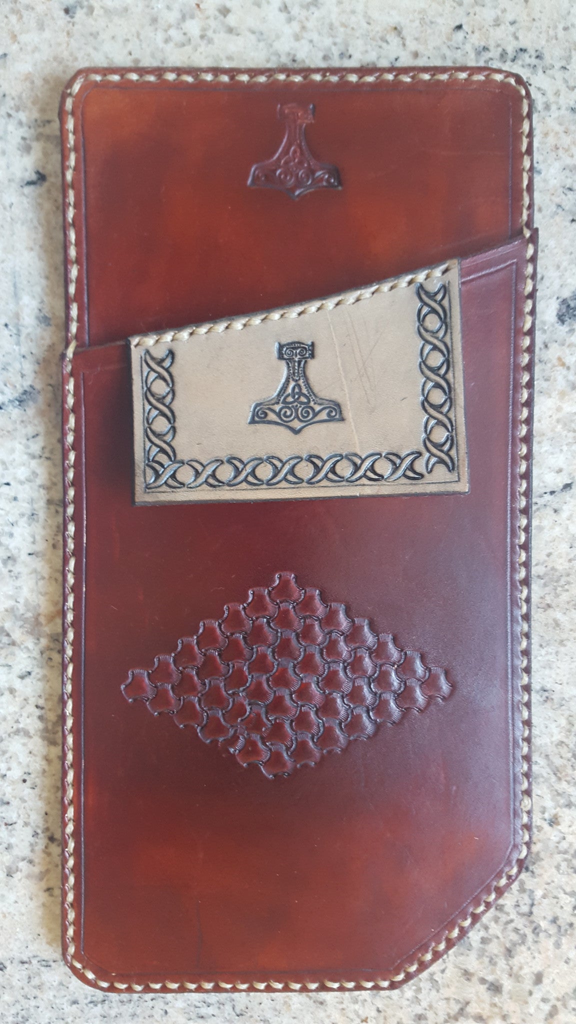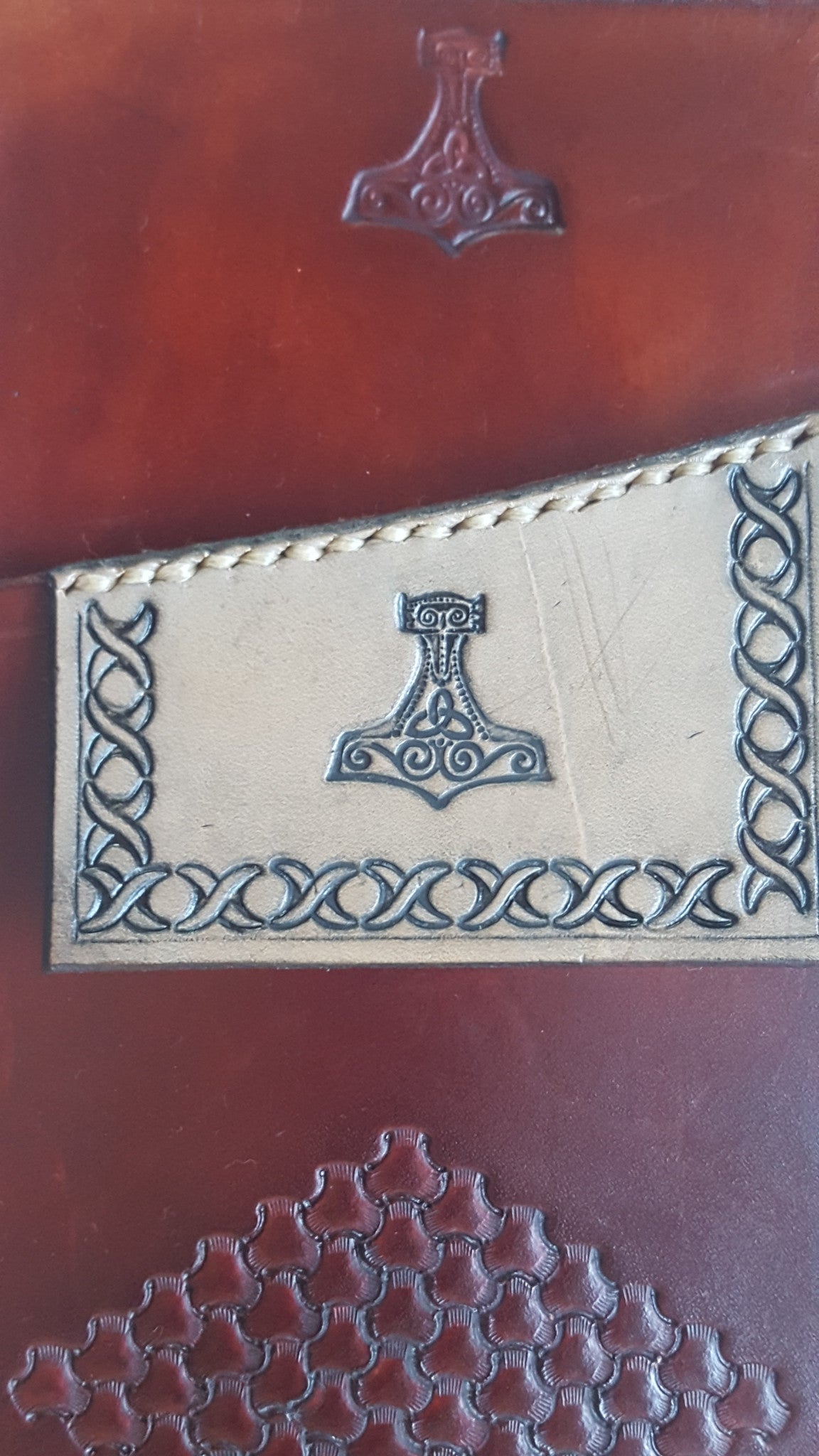 A Mahogany dye has been used on the main body of the quiver with a basket weave pattern and a Smoke Black Antique has been used on the pocket flap to make the Thor's Hammer stamp stand out..