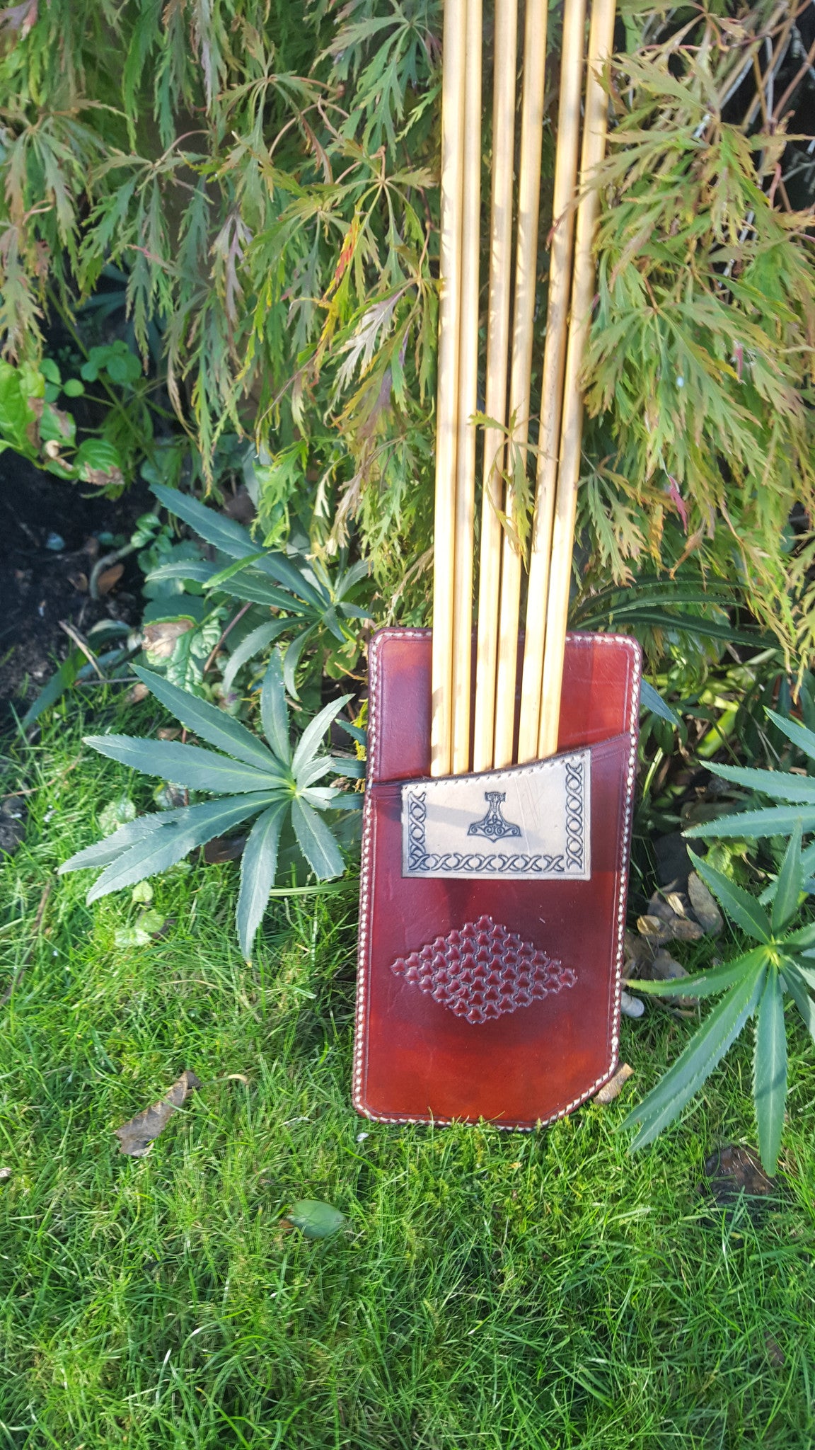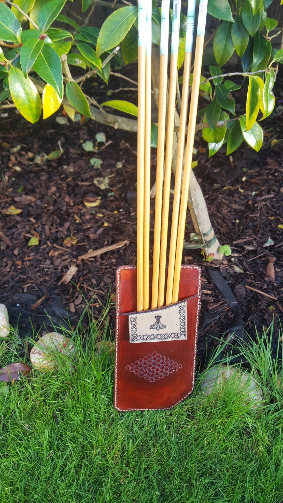 Made from high quality 3.5 mm veg tan leather, this quiver has been all completely hand made from the tooling to the dyeing to the stitching.