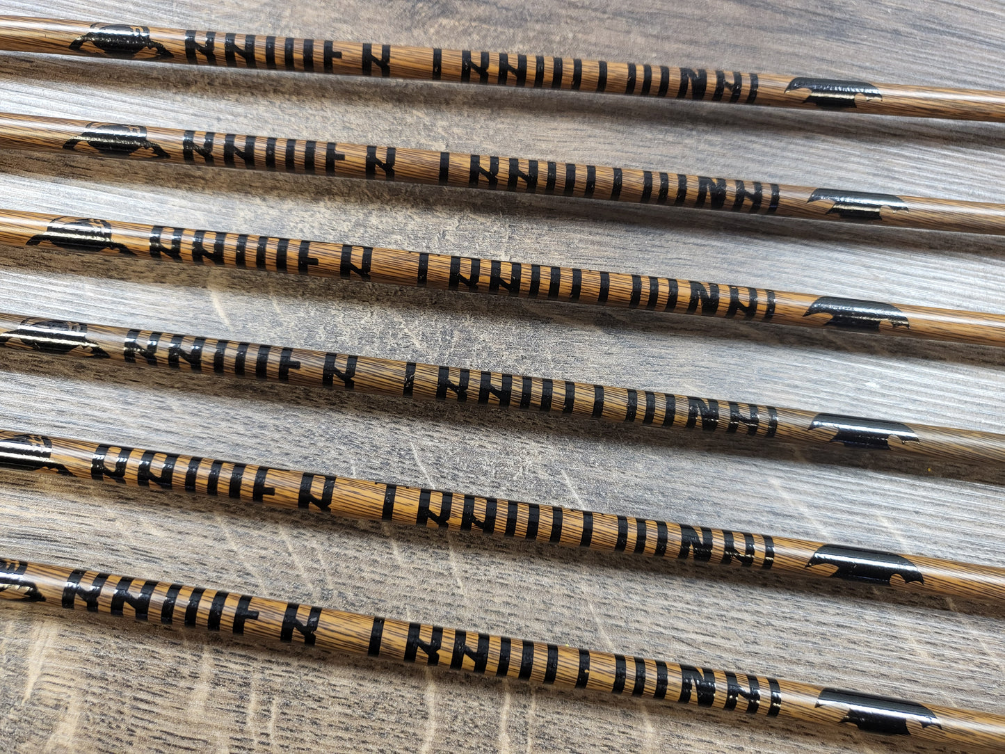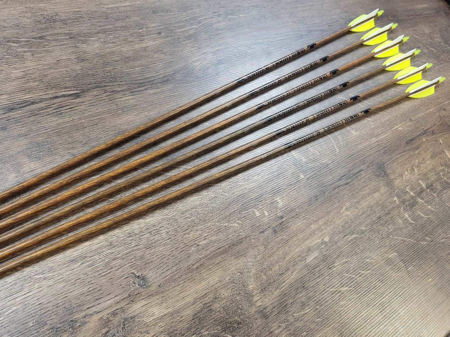 The Raider Trad Carbon is a 6.2mm external diameter carbon shaft with a wood coloured wrap. The arrows come with inserts and as standard Saunders combo screw-in points (TopHat points are available as an upgrade for an additional £10 per Dozen). They are fletched with three inch Gateway Left Wing feathers and come with a White Nock. The Carbon Shaft is 32" long so with point and nock they will be slightly longer. The weights are as follows :