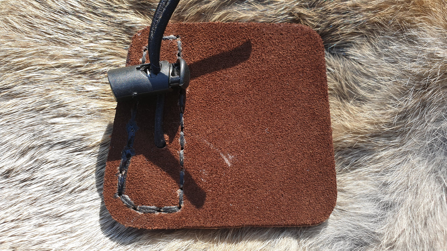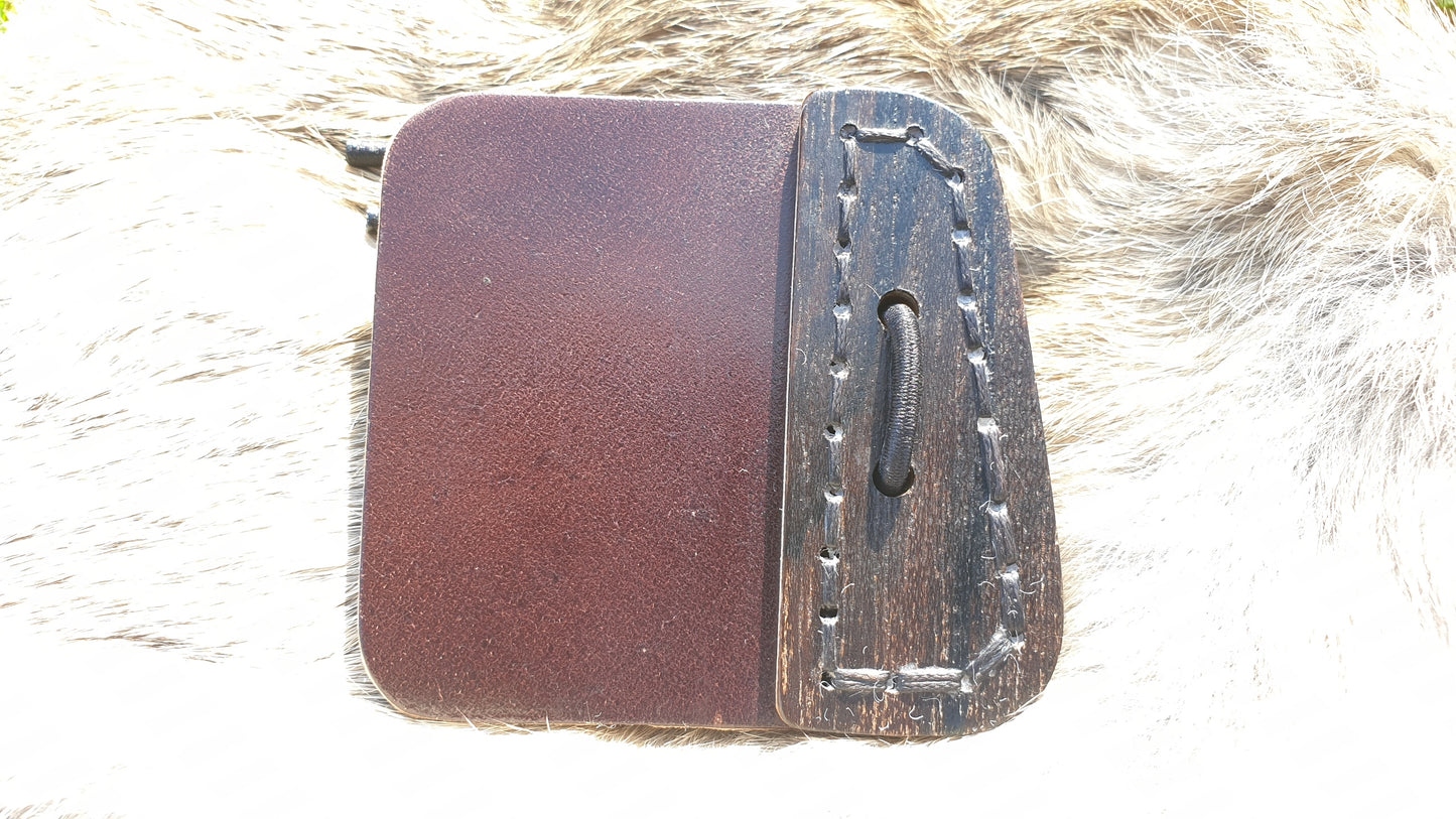 A beautiful barebow finger tab used for three under finger arrow release. The face leather is Horween Shell Cordovan for tough durability, combined with a smooth loose.